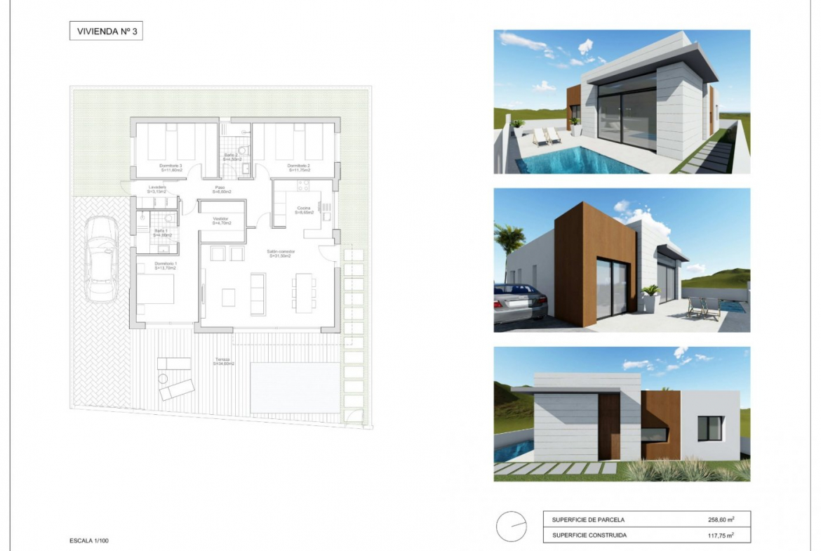 Las villas de nueva construcción de una sola planta tienen 3 dormitorios, 2 baños, cocina abierta con el salón, armarios empotrados, jardín privado con plaza de aparcamiento.