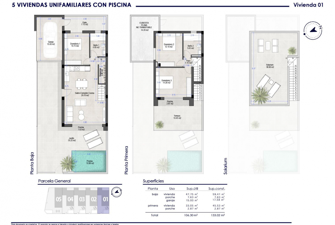 This exclusive development of 5 semi-detached villas is located in San Pedro del Pinatar, a vibrant coastal town in the Costa Cálida. Positioned near the municipal sports center, within walking distance to the town center, and just 3.5 km from the beaches of the Mar Menor and Mediterranean, these homes offer the perfect blend of comfort, convenience, and Mediterranean lifestyle.